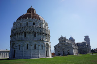 Our drive to Nice was picturesque as we cruised along the Mediterranean coast. We saw expansive fields with little farmhouses nestled between fence rows of tall, pointy cypress trees. After a few hours of driving we stopped in Tuscany at the ancient town of Pisa to see for ourselves if the tower really does lean. We parked the bus and walked straight to the Piazza del Duomo where three historic buildings are located; The Baptistery, the Cathedral, and the Cathedral's famous free standing bell tower, more commonly known as the Leaning Tower of Pisa. The Plaza is beautiful with a huge lawn of perfectly manicured grass.